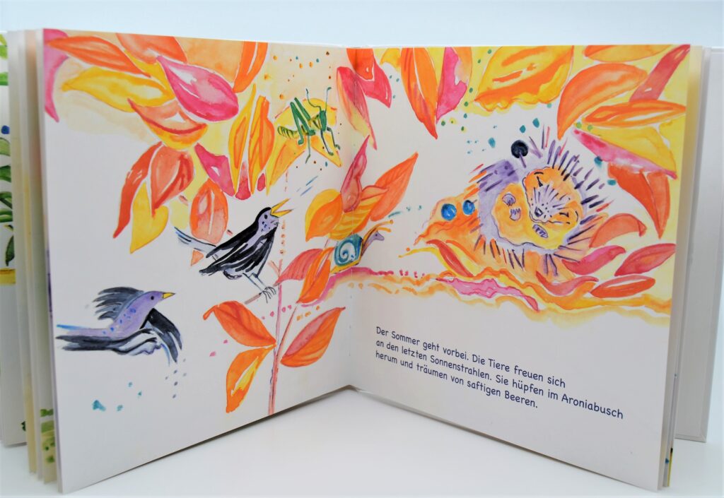 Als ein Freund rund um sein Bauernhaus Aronia-Sträucher pflanzte, war ich fasziniert von der mir unbekannten Heilpflanze. Ich erfand eine Geschichte über die «Powerbeere» und produzierte mein erstes eigenes Buch. Meine Vorliebe für kräftige Farben kam dabei gut zum Ausdruck, da sich die leuchtenden Töne mit der Lebensenergie und der heilenden Kraft der Aronia wunderbar ergänzen.